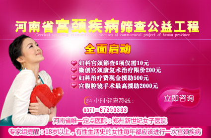 根据《关于医药卫生体制改革近期重点实施方案》确定的重点工作,2009年中国妇女健康促进工程、中国宫颈癌防治工程组委会、郑州市妇联联合决定郑州新世纪女子医院为河南地区宫颈专项筛查定点医院,已为20余万人次完成宫颈专项筛查,2013宫颈疾病专项筛查已启动。