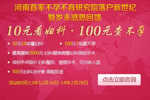 [导读]: 河南不孕不育研究院落户新世纪暨岁末感恩回馈 10元看妇科100元查不孕 活动时间:12月30日-1月29日 为庆祝河南不孕不育研究院郑州市新世纪不孕不育研究院落户新世纪,以及感 ...