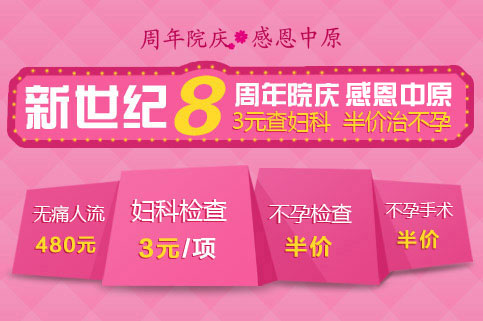 [导读]: 周年院庆 三月献礼 3元查妇科 半价治不孕 主办单位:郑州新世纪女子医院 新世纪不孕不育研究院 技术支持:中国医师联合会 活动时间:3月1日-3月31日 值此郑州新世纪女子医院院庆 ...
