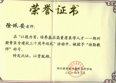 2014年3月,我院医生徐佩安教授,再次被评为“郑州澍青医学高等专科学校功勋教师”。提起徐佩安教授,无论是同事,还是她的病人,都会竖起大拇指,对她赞不绝口。这位78岁的妇科医生,在从医以及教学的50余年中,一直严格要求自己,不断探索、钻研科学知识,在妇科诊疗以及女性不孕的诊治方面卓有建树,并把自己的实践与经验应用在教学工作中,培养了大量科学医疗人才。