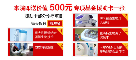 凡来院就诊的患者,可独享中国医师联合会提供的500元治疗专项基金援助卡一张(每天仅限前30名),当日即可享受由郑州新世纪女子医院提供的意大利温妮纳米蓝氧生物技术、BYK腔道生物介入系统、CRS消融系统、夏洛特生物离子波技术、可尔WM-Ⅲ妇科多功能综合治疗仪等诊疗项目援助,凡每次消费达100(含)元以上,可享受治疗费减免50元/天/人。