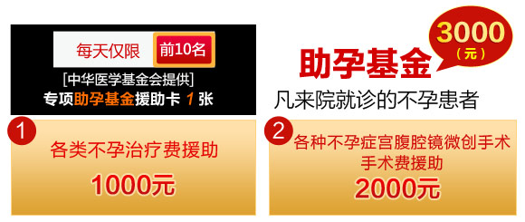 凡来院就诊的不孕患者,可独享中华医学基金会提供的价值3000元专项助孕基金援助卡一张(每天仅限前10名)。