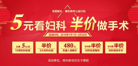 [导读]: 引言: 2016年新年来临之际,郑州新世纪女子医院倾情回馈广大河南女性朋友, 2016年1月1日2月29日 ,浓情推出名医献礼暖冬跨年公益行动, 5元看妇科 半价做手术。彩超、阴道镜等妇科 ...
