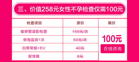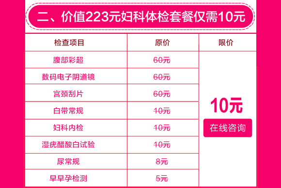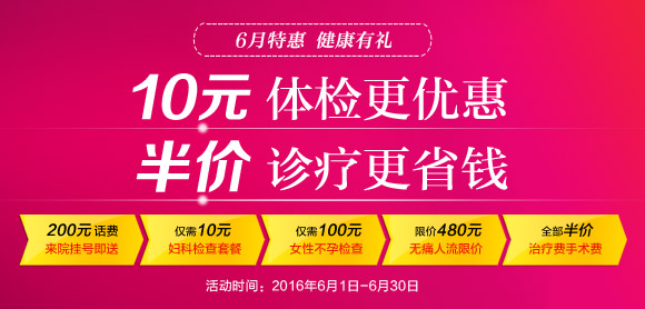 6月特惠,健康有礼。2016年6月1日-6月30日,郑州新世纪女子医院“10元体检更优惠 半价诊疗更省钱”,活动期间来院挂号即送200元话费,价值223元妇科检查套餐仅需10元,价值258元的女性不孕检查仅需100元,人流限价480元,妇科治疗费、手术费全部半价。