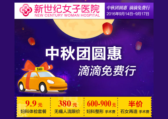 [导读]: 健康过中秋,郑州新世纪女子医院浓情推出 中秋团圆惠 滴滴免费行 关爱女性健康活动: 价值238元的妇科体检套餐仅需9.9元, 可尔依无痛人流限价380元 , 妇科整形限价600-900元,石女 ...