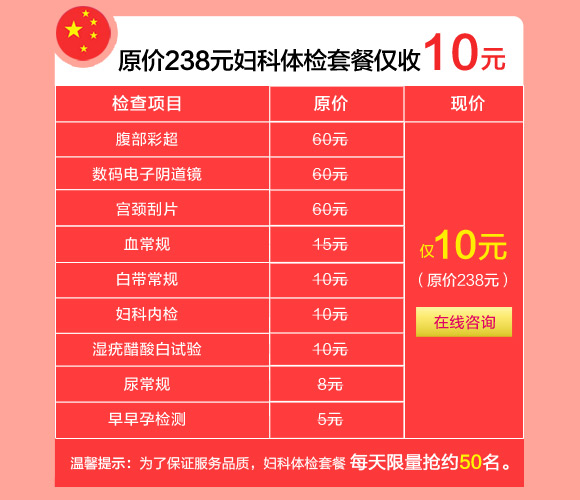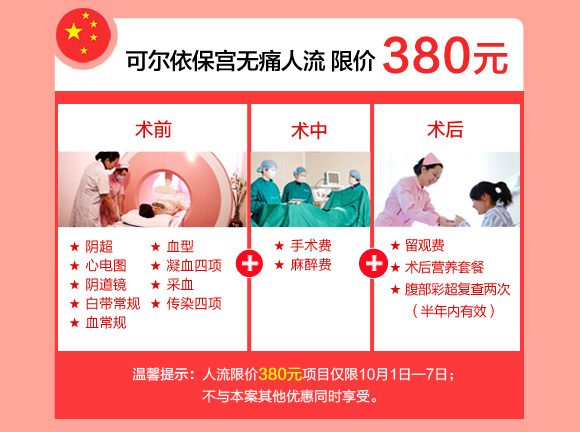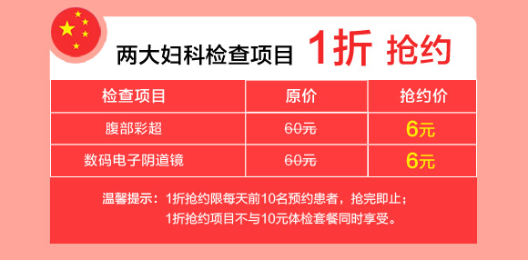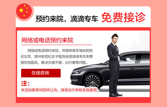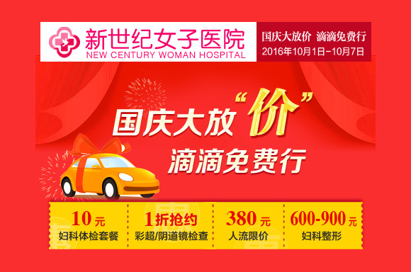 十一黄金周,郑州新世纪女子医院浓情推出“国庆大放‘价’ 滴滴免费行”关爱女性健康活动:价值238元的妇科体检套餐仅需10元,彩超、阴道镜检查1折抢约,阴道护理限价50元/次,可尔依保宫无痛人流限价380元,妇科整形限价600-900元,石女再造手术费半价,宫外孕等妇科微创手术费半价,预约尊享滴滴专车免费接诊,为河南女性健康保驾护航。