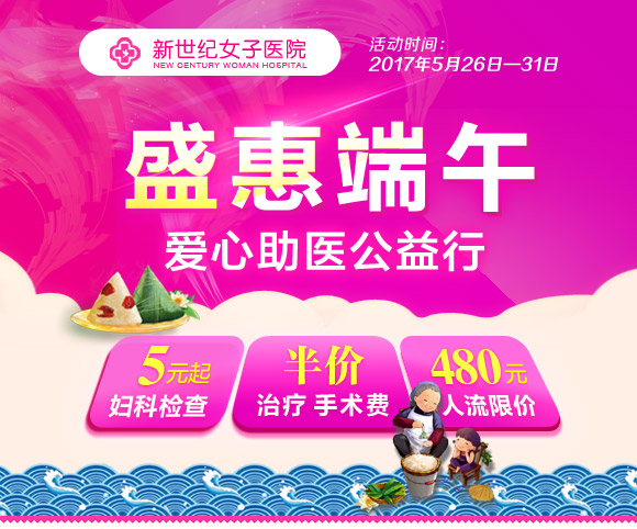 [导读]: 2017年5月26日-5月31日,郑州新世纪女子医院于推出盛惠端午 爱心助医公益行活动,妇科检查5元起,人流限价480元,私密整形手术费、治疗费、手术费半价等惠民活动 ...