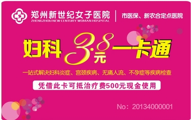 为什么胡女士会一下子喜欢上这家医院?她手里那张卡片,其实是来自中国医师协会和郑州新世纪女子医院联合举行的“河南省第二届女性健康惠民工程”援助活动中所申领的妇科3.8元一卡通,有了这张卡片,就可以获得12项妇科检查3.8元/项(原价525元),检查项目包括腹部彩超、数码电子阴道镜、输卵管造影、卵泡监测、宫颈刮片、淋球菌感染检测、早早孕检测、妇科内检等项检查。》》》点击在线咨询了解详情