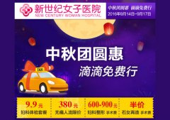 健康过中秋,郑州新世纪女子医院浓情推出 中秋团圆惠 滴滴免费行 关爱女性健康活动: 价值238元的妇科体检套餐仅需9.9元, 可尔依无痛人流限价380元 , 妇科整形限价600-900元,石女...[详细]
