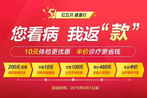 红五月,健康行。郑州新世纪女子医院倾情回馈广大女性朋友,2016年5月1日起,浓情推出 您看病 我返款 活动,活动期间 来院就诊即送200元话费,223元妇科检查套餐仅需10元,无痛人流...[详细]